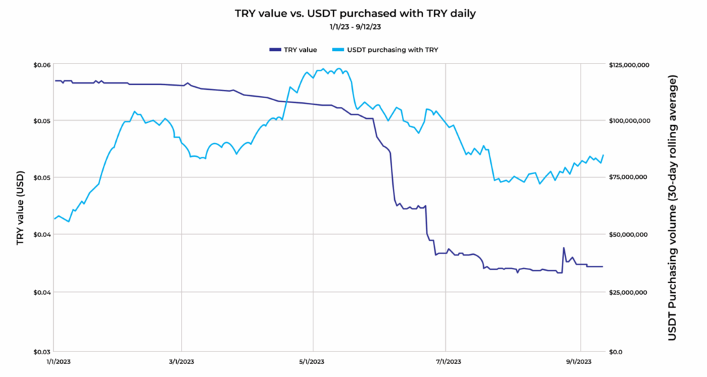Many individuals use stablecoins to store value, especially in regions where local currencies are unstable due to censorship, inflation, or other economic issues. For example, in Turkey in 2023, citizens were selling nearly $100mm of Turkish Lira monthly to buy and hold USDT.